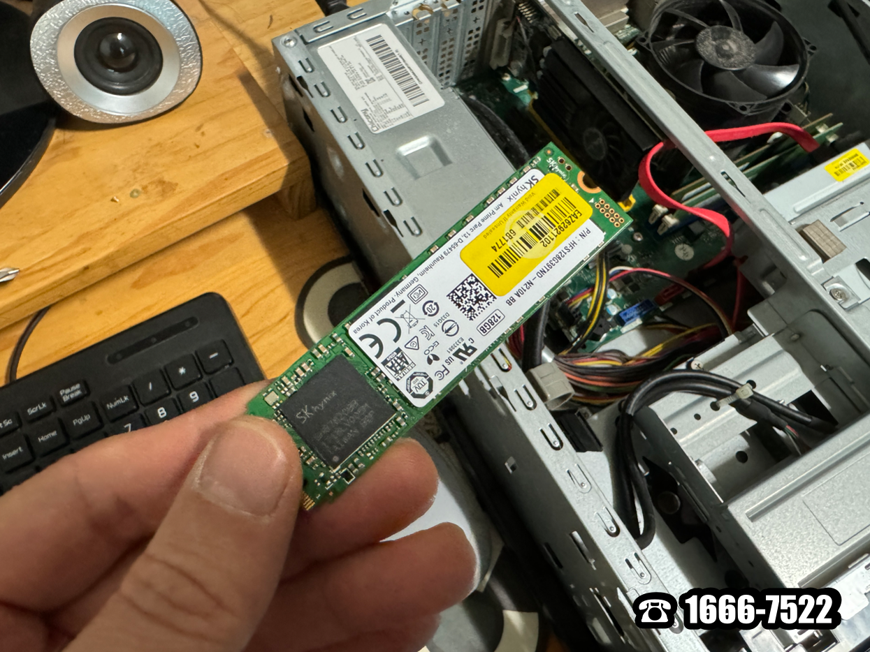 이런 경우는 하드디스크 고장이나 접촉불량일 가능성이 큽니다. 특히 M.2 SATA, M.2 NVMe 방식은 세월이 지나면 접촉불량이 흔하게 발생합니다. 그래서 마포구 공덕동 컴퓨터수리는 가장 먼저 조치해 보는 거죠. 덮개를 열고 나사 하나를 풀어서 HFS128G39TND-N210A를 탈착했습니다. 그리고 M.2 SATA 슬롯은 솔로 털어내고 금으로 도금된 접점 부분은 지우개로 닦고 장착했습니다.