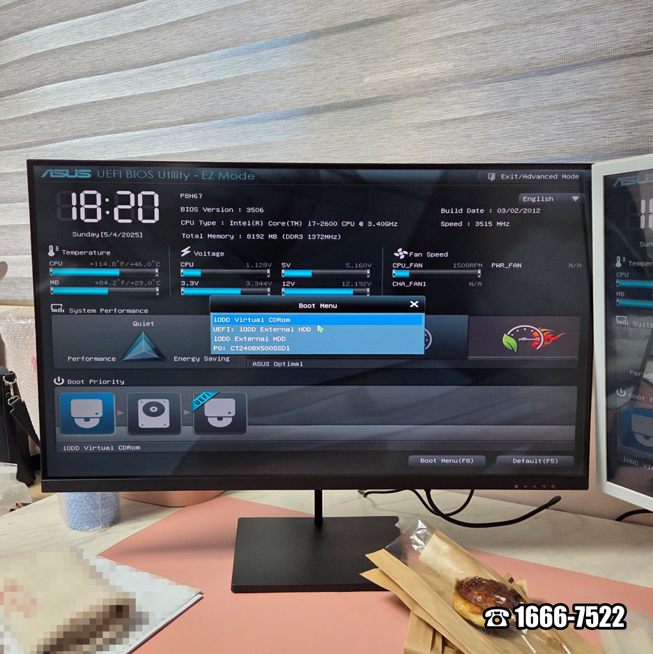 그런데 재부팅을 했더니 바로 증상이 발생합니다. ㅠㅠ 결국 CT240BX500SSD1에 연결된 SATA 케이블을 분리했다가 다시 연결했습니다. 그럼에도 이젠 부팅조차 안됩니다. 재부팅하고 단축키 DEL을 눌러 ASUS P8H67 메인보드 바이오스에 진입했습니다. 모든 장치가 잘 작동합니다. 은평구 불광동 컴퓨터수리는 Exit/Advanced Mode를 클릭해 고급모드로 진입합니다. 한 번씩 확인하는데 Advanced에서 SATA Mode Selection를 보니 IDE로 설정됐습니다. ㅠㅠ AHCI로 변경하고 다시 EZ Mode로 이동했습니다. 단축키 Boot Menu (F8)을 눌러 iODD Virtual CDRom을 선택합니다.