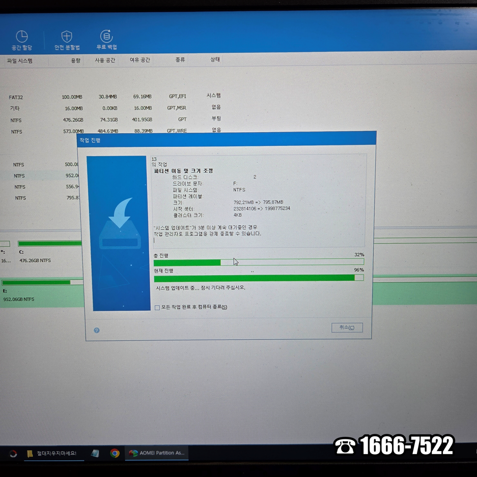 만약 소프트웨어로 작업한다면... 파티션은 비율로 자동으로 설정될 것입니다. 하지만 하드웨어로 작업했을 경우는 다릅니다. 파티션 설정을 다시 해야 합니다. Cloud 2.5" SSD 1TB에 SATA 젠더를 꼽고 노트북에 연결했습니다. 그리고 AOMEI Partition Assistant를 실행했습니다. C드라이브를 할당되지 않은 공간까지 확 늘렸습니다. 아주 간단한 작업이지만 많은 분들이 어려워하는 부분이기도 합니다.