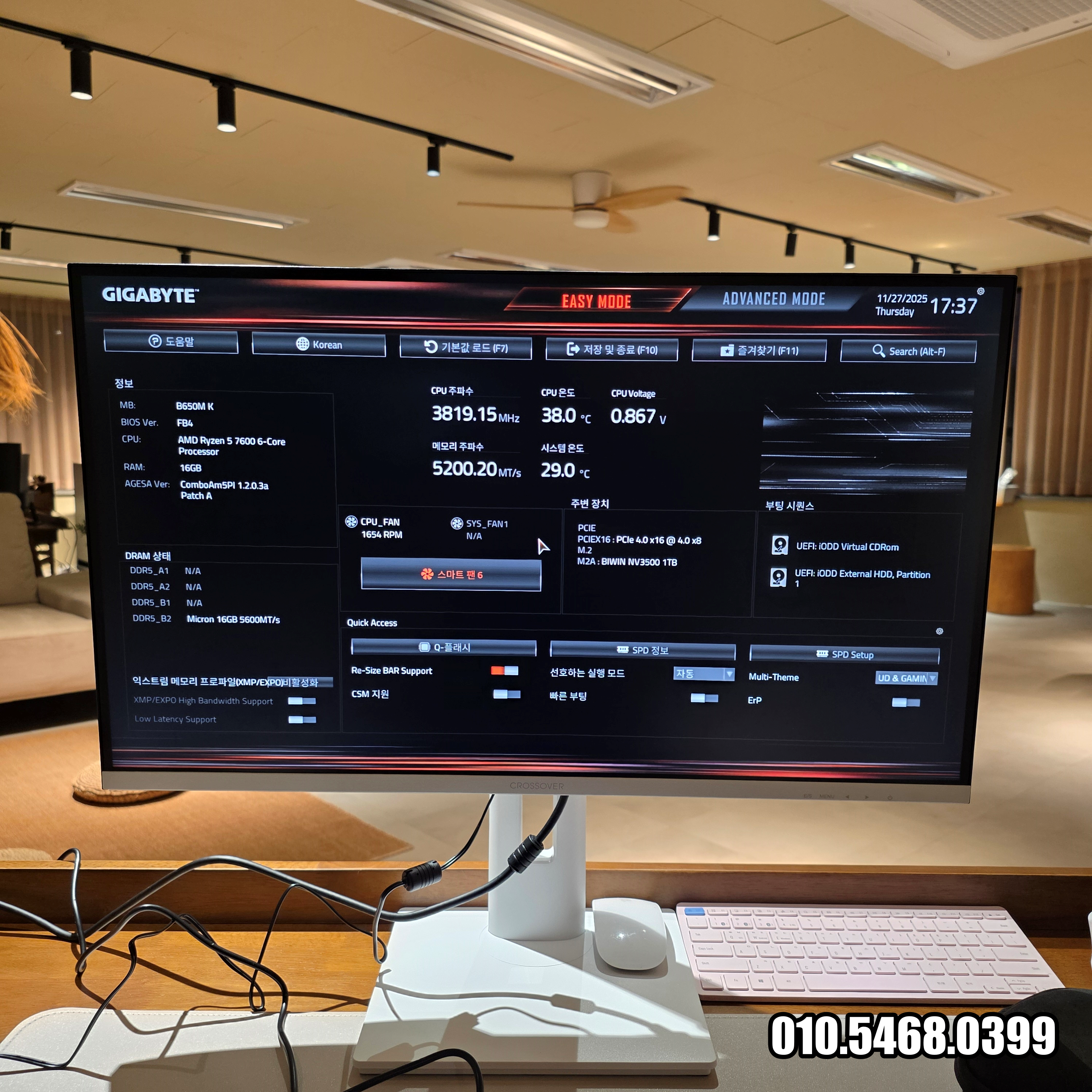 전원 버튼을 눌렀더니 전원도 잘 켜지고 화면도 나옵니다. 아마도 초기 불량은 없을 듯합니다. 단축키 DEL을 눌러 GIGABYTE B650M K 메인보드 바이오스에 진입했습니다. 모든 장치가 잘 작동하고 있습니다. 또한 발열도 없습니다. 이것저것 확인한 다음에 부팅 시퀀스에서 미리 연결한 iODD Virtual CDRom을 첫번째 순서로 설정하고 단축키 F10을 눌러 저장합니다.