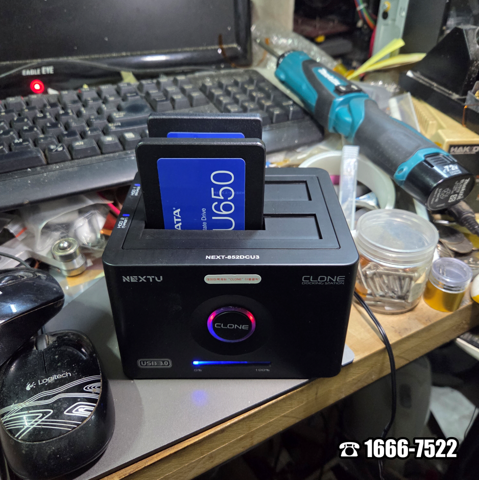 현재 SATA SSD는 물론 mSATA, M.2 SATA, M.2 NVMe 등 모든 기종이 가능합니다. 항상 차량에 비치하고 다녀요^^ 그래서 현장에서 바로 가능합니다. NEXT-852DCU3 도킹에 원본과 복사본을 꼽고 SSD 복사 (마이그레이션)을 진행합니다. 상태에 따라 소요되는 시간은 다르겠지만 그리 오래 걸리지는 않습니다.