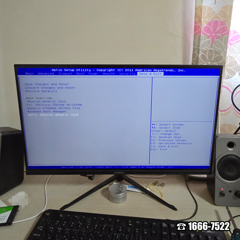 그런데 사진으로는 볼 수 없지만 많은 일이 있었습니다. 특히 모니터 화면이 켜졌다 꺼졌다 합니다. 또 잘 될때는 잘 됩니다. 필요하시다면 바로 현장에서 모니터 판매도 가능하다고 말씀드렸습니다. 윈도우10으로 설치하기 위해서 전원을 켜고 단축키 F2를 눌러 FOXCONN H61MXT1/F2/-S/-V 메인보드 바이오스에 진입했습니다. Save & Exit에서 JMicron Generic 0215를 선택했습니다.