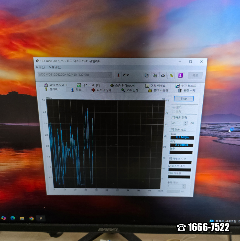 그래서 점검부터 시작했습니다. 눈으로 본다고 알 수 있는 부분은 아니니까요^^ 내 PC에 진입해 C드라이브 용량부터 확인했습니다. 그리고 Intel(R) Core(TM) i3-2120 CPU 구성이지만 윈도우10으로 사용하기에 전혀 문제는 없습니다. HD Tune Pro도 실행했죠. WDC WDS120G2G0A-00JH30에 벤치마크 속도는 엉망이었습니다. 이 정도는 고장으로 진단하는 것이 맞습니다. 최소한 50은 넘어야 하니까요^^