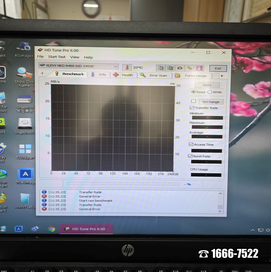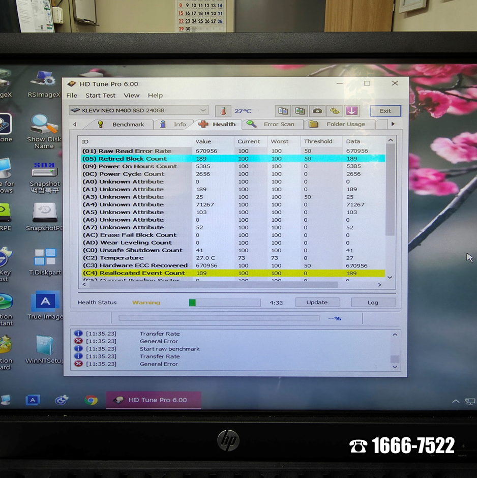 만약 사무용 조립PC라면 중요한 자료도 많을 것입니다. Windows10 PE로 부팅했고 내 PC에 진입하니 모든 드라이브는 살아 있었습니다. 마포구 염리동 컴퓨터수리도 안심할 수 있었죠. HD Tune Pro를 실행해 KLEVV NEO N400 SSD 240GB를 테스트했습니다. 음... 벤치마크 속도는 진행조차 안되고 디스크 상태에도 (05) Retired Block Count, (C4) Reallocated Event Count 오류가 뜹니다. 고장입니다. 그나마 데이터 백업은 가능해서 백업용인 SAMSUNG HD502HJ 하드디스크에 옮길 수 있었습니다.