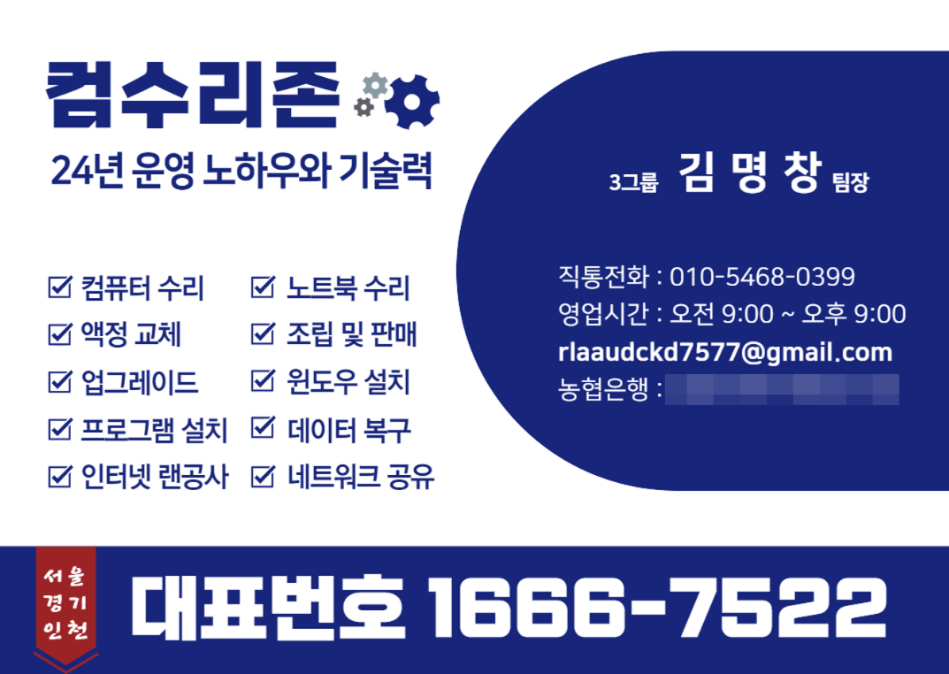 ⏰ 컴수리존 영업시간 : 오전 9:00 ~ 오후 9:00 (주말,휴일,야간,당일 출장 가능)