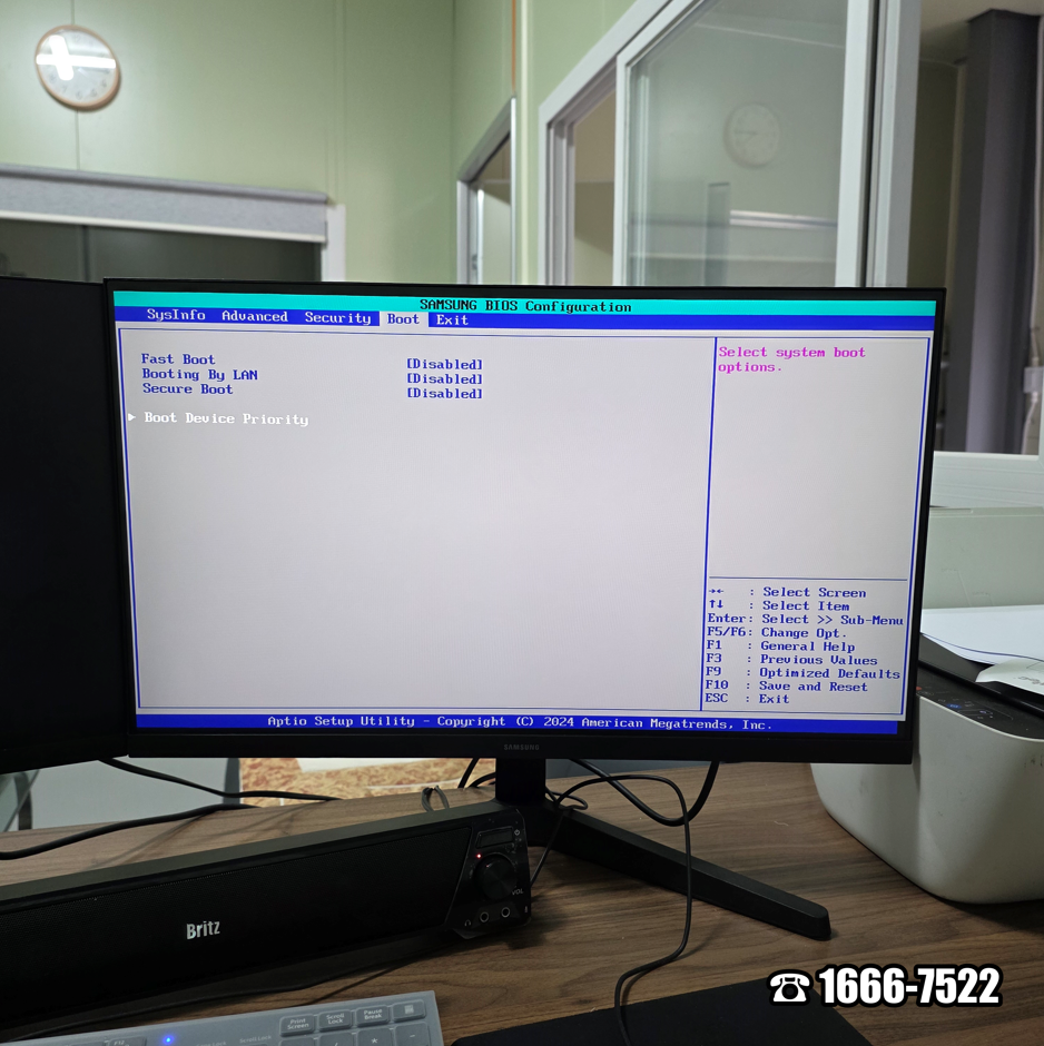 이전에 왔던 출장 기사가 GeForce GTX 1050 그래픽카드 쿨러가 안돈다고 탈착했다네요 ㅠㅠ 다시 장착해 달라고 부탁까지 하셨습니다. 음... 발열이 없다면 안 돌 수도 있습니다. 전원을 켜고 단축키 F2를 눌러 삼성 DV400TFA-Z2R/C 컴퓨터 바이오스에 진입했습니다. Boot에서 Secure Boot를 끄고 Boot Device Priority를 클릭합니다. iODD Virtual CDRom을 첫 번째 순서로 설정하고 Exit에서 Exit Saving Changes를 선택해 저장합니다.