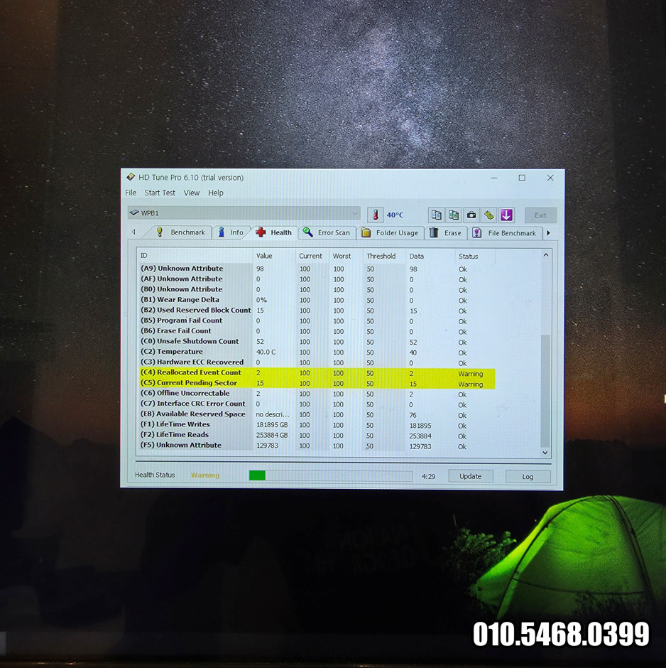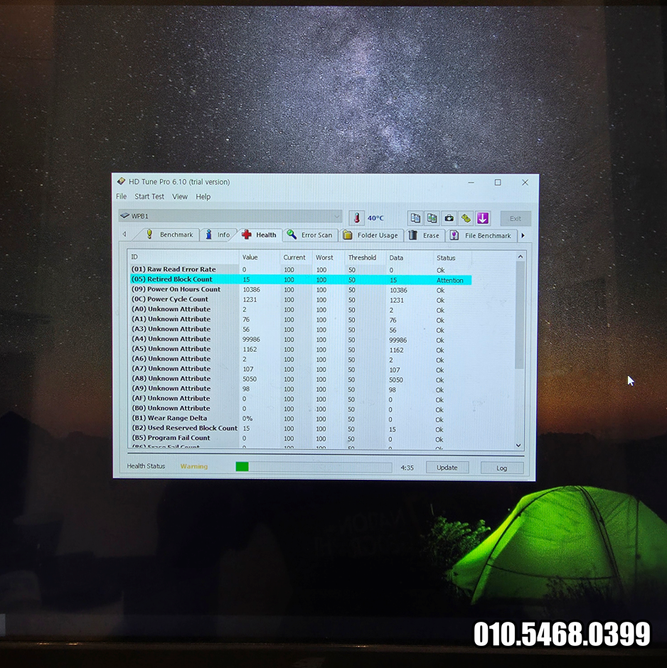 HD Tune Pro를 실행했습니다. MICRONICS WARP B1 SSD 256GB를 테스트했는데 벤치마크 속도는 그렇다치고 디스크 상태에서는 (05) Retired Blokk count, (C4) Reallocated Event Count, (C5) Current Pending Sector 오류가 뜹니다. 강서구 우장산동 컴퓨터수리는 당연히 고장으로 진단했고 중요한 자료는 임시로 iODD 2541 외장 하드에 백업해 두었습니다.