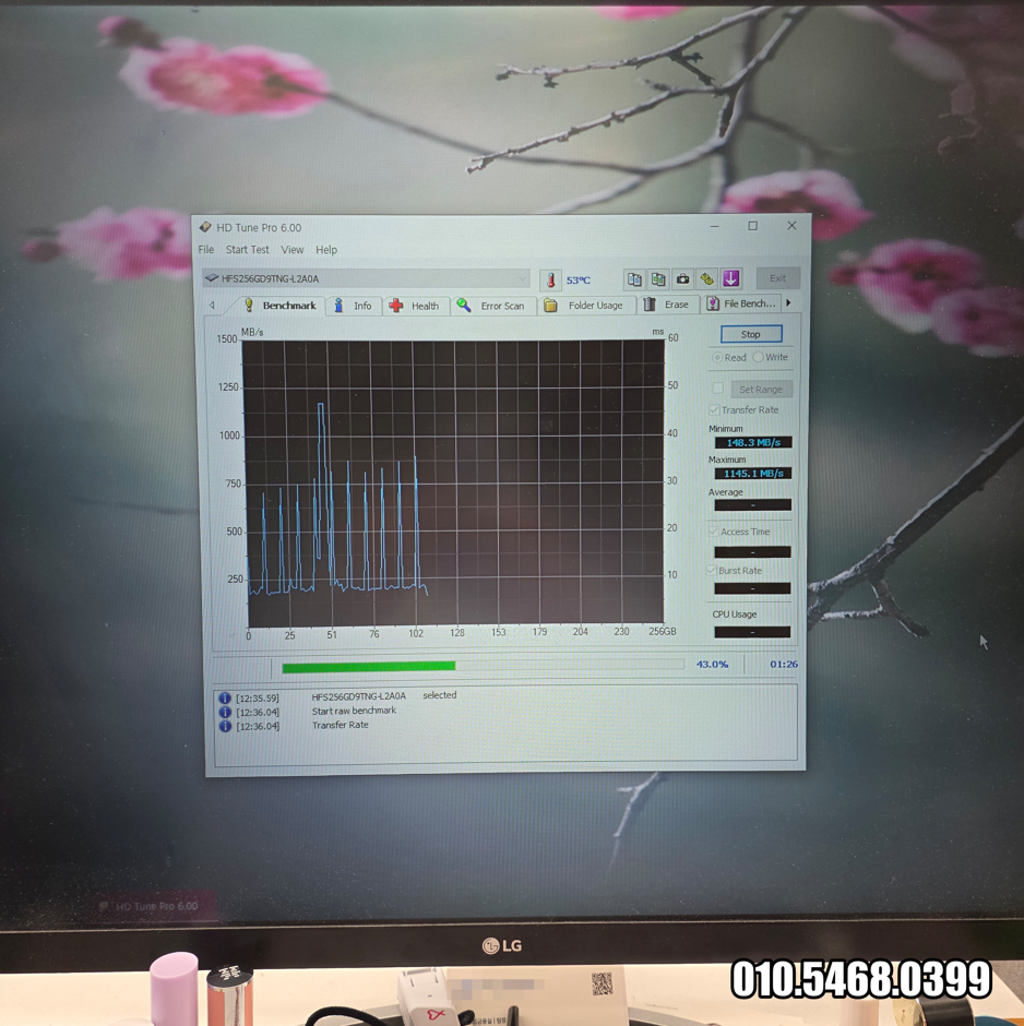 다행히 Windows10 PE 부팅은 가능했습니다. 내 PC에 진입했습니다. 다행히 드라이브는 살아 있었습니다. 그렇다면 백업은 가능하다는 말이겠죠? 구로구 개봉동 컴퓨터수리는 HD Tune Pro를 실행했습니다. HFS256GD9TNG-L2A0A에 벤치마크 속도는 엉망이었고 디스크 상태는 Warning Temperature Time 오류가 뜹니다. ㅠㅠ 아무것도 하지 않는데 53도를 가리키고 있습니다. 사용자가 원하는 대로 데이터 백업을 하는데... 거의 안됩니다.