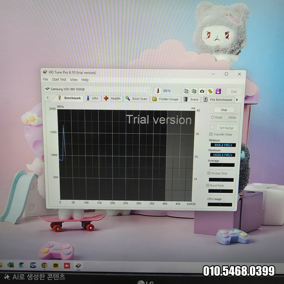 증상만 확인하고 기본 점검부터 진행하기로 했습니다. 내 PC에 진입해 C드라이브 용량을 확인했더니 여유롭게 남아 있었습니다. AMD Ryzen 5 4600G CPU 구성이면 사양이 충분하죠? 부족함은 없었고 드라이버 충돌도 없었습니다. HD Tune Pro를 실행해 Samsung SSD 980 500GB도 테스트했지만 고장 증상은 보이지 않았습니다. 이대로 진행해도 될 것 같습니다.