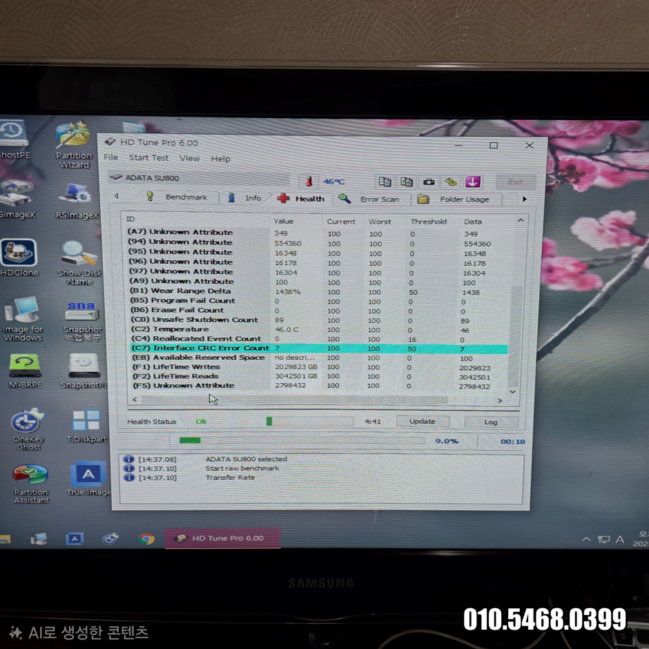 Windows10 PE는 드라이버가 로드되지 않은 상태입니다. 단점도 있겠지만 장점이 더 많습니다. 순조롭게 부팅할 수 있었고 내 PC에 진입하니 모든 드라이브는 살아 있었습니다. 다행이죠? 별내동 남양주 컴퓨터수리는 HD Tune Pro를 실행해 ADATA SU800 SSD 128GB를 테스트했습니다. 안타깝게도 (C7) Interface CRC Error Count 오류가 뜹니다. 고장이죠. 그나마 다행인 것은 데이터 백업은 모두 가능했고 WDC WD10EZEX-22MFCA0 하드디스크에 저장했습니다.