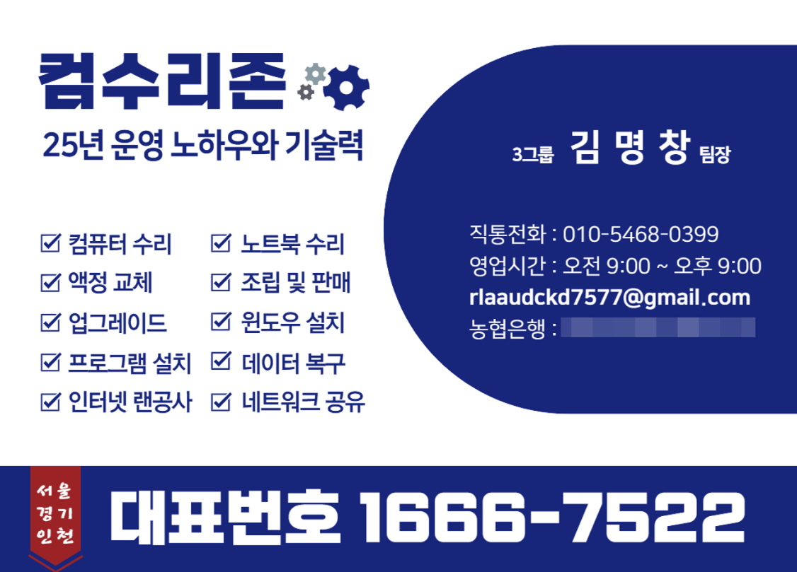 ⏰ 컴수리존 영업시간 : 오전 9:00 ~ 오후 9:00 (주말,휴일,야간,당일 출장 가능)