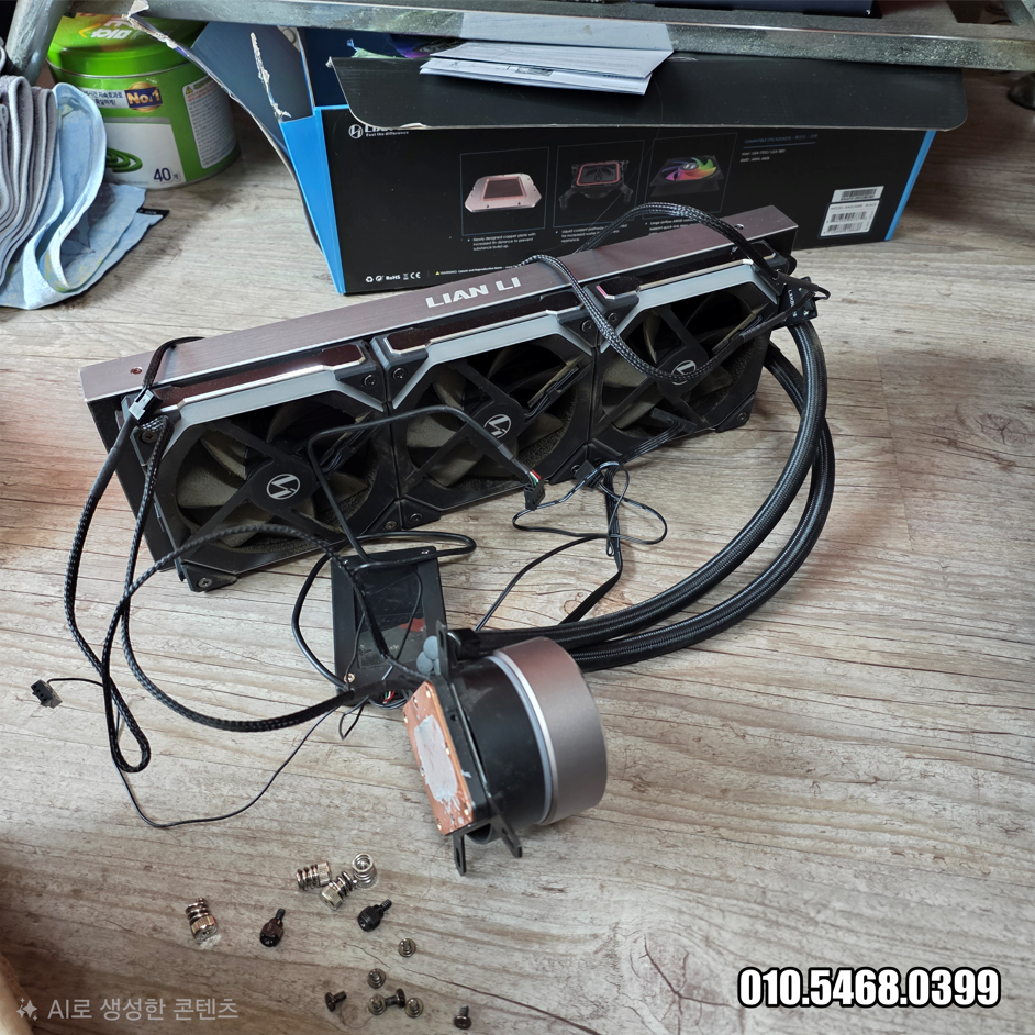수랭쿨러 교체는 수리 기사님들도 못하는 분들 많습니다. 그만큼 흔하게 볼 수 있는 것도 아니고 제품도 다양합니다. 또한 다른 하드웨어와 호환도 생각해야 합니다. 그래서 그 시절에 나온 제품을 찾아 교체해 드리죠. 고장난 수랭쿨러를 탈착했습니다. 그리고 동일한 제조사 제품이었습니다. 신형이라는 말이겠죠? 바로 교체해 드렸습니다. Geforce RTX 3080 Ti 그래픽카드는 탈착하고 진행했습니다.