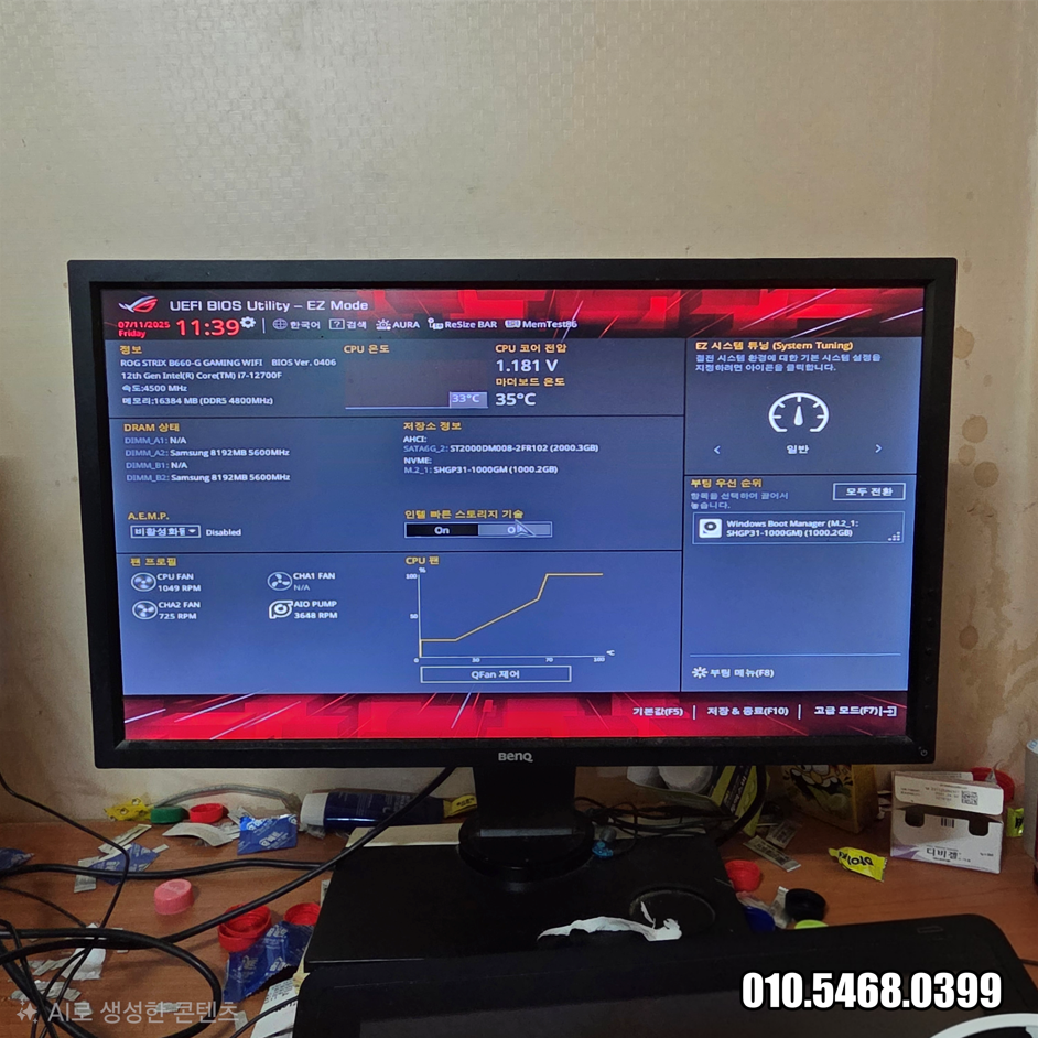 전원을 켜고 단축키 F2를 눌러 ROG STRIX B660-G GAMING WIFI 메인보드 바이오스에 진입했습니다. 다행히 Intel(R) Core(TM) i7-12700F CPU 온도는 33도입니다. ㅎㅎㅎ 곧바로 윈도우 부팅을 시도했습니다. 손상은 없었습니다. 드라이버 충돌도 보이지 않습니다. 이대로 사용하시면 될 것 같아서 마무리했습니다. 지금까지 수택동 구리 컴퓨터수리의 찐 후기였습니다.