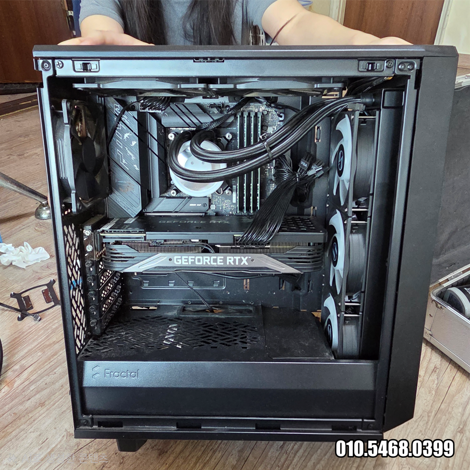 옆에서 지켜보시더니 ㅋㅋㅋ 직접 시도도 하려고 했답니다. 보고 있으니 못했을 거라고 하시더군요^^ 이제 케이블을 잘 정리해 줍니다. 현재 수택동 구리 컴퓨터수리는 공랭쿨러는 두가지 종류로 가지고 다니지만 수냉쿨러는 사용자가 원하는 제품으로 준비를 해야 하기 때문에 가지고 다니지 않습니다. 필요하시다면 연락 주세요^^ 어때요? 깔끔하게 정리됐죠?
