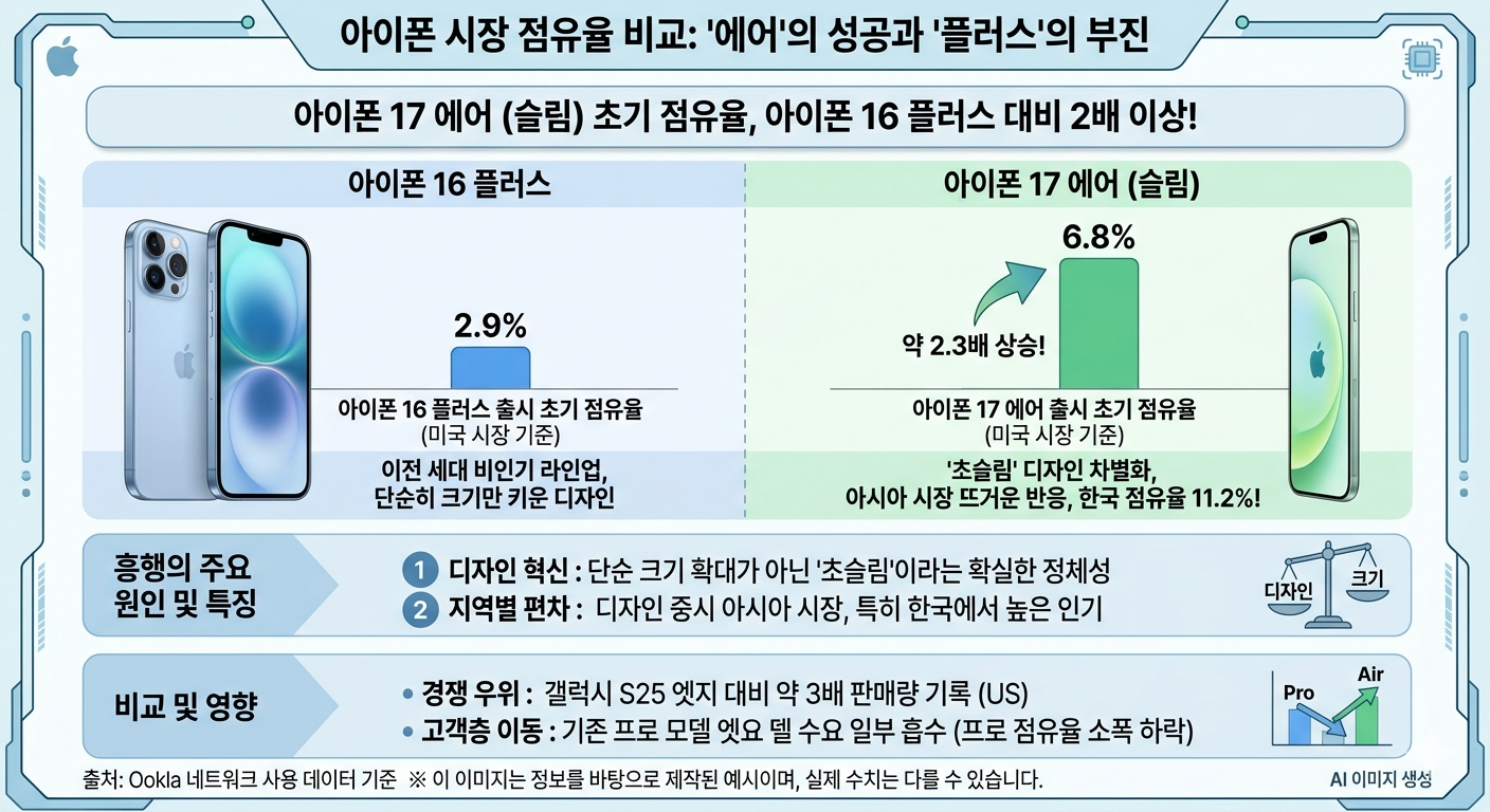 | 아이폰 17 에어 | 약 6.8% | 플러스 대비 약 2.3배 상승 |