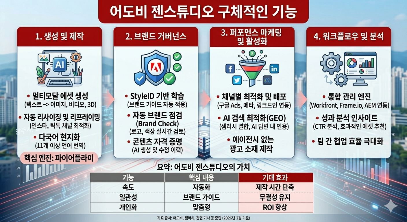 현재 어도비 젠스튜디오(Adobe GenStudio)는 생성형 AI를 활용해 기업의 콘텐츠 기획부터 제작, 배포, 분석까지 전 과정을 통합 관리하는 '엔드투엔드(End-to-End) 콘텐츠 공급망 솔루션'입니다.
