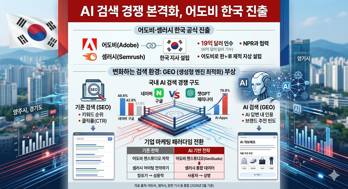 2026년 3월 현재, 어도비(Adobe)가 19억 달러(약 2조 6,000억 원)에 인수한 글로벌 검색 가시성 플랫폼 '셈러시(Semrush)'가 한국 시장에 공식 진출하면서 국내 AI 검색 및 마케팅 시장의 경쟁이 새로운 국면을 맞이하고 있습니다.