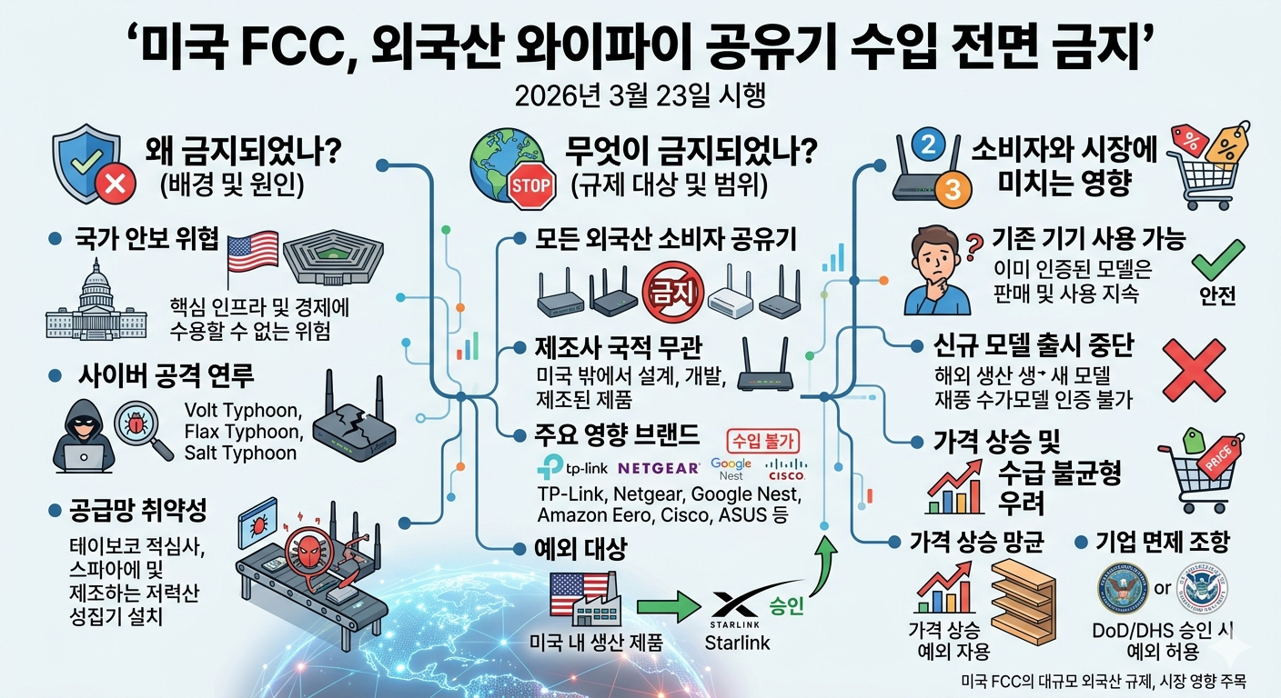 미국 연방통신위원회(FCC)는 2026년 3월 23일, 국가 안보와 사이버 보안 위협을 이유로 미국 외 지역에서 생산된 모든 소비자용 와이파이 공유기(라우터)의 신규 수입 및 승인을 전면 금지했습니다.