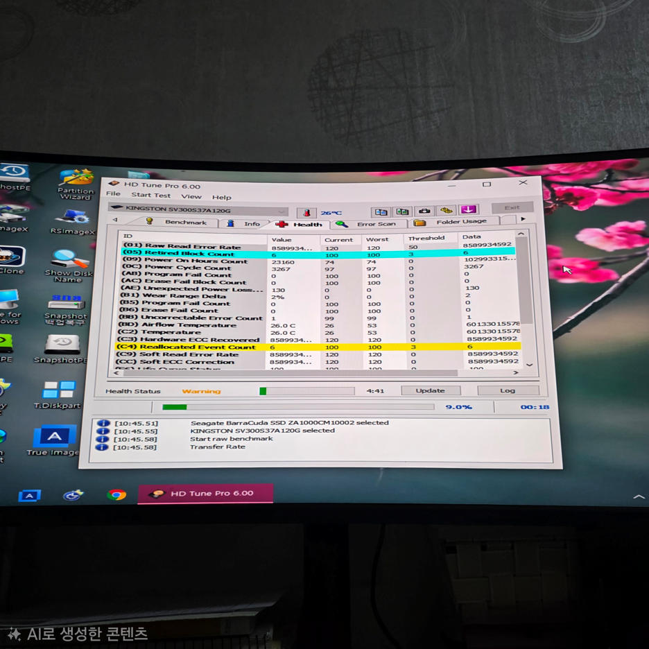 KINGSTON SV300S37A120G는 (05) Retired Block Count와 (C4) Reallocated Event Count 오류가 발생합니다.