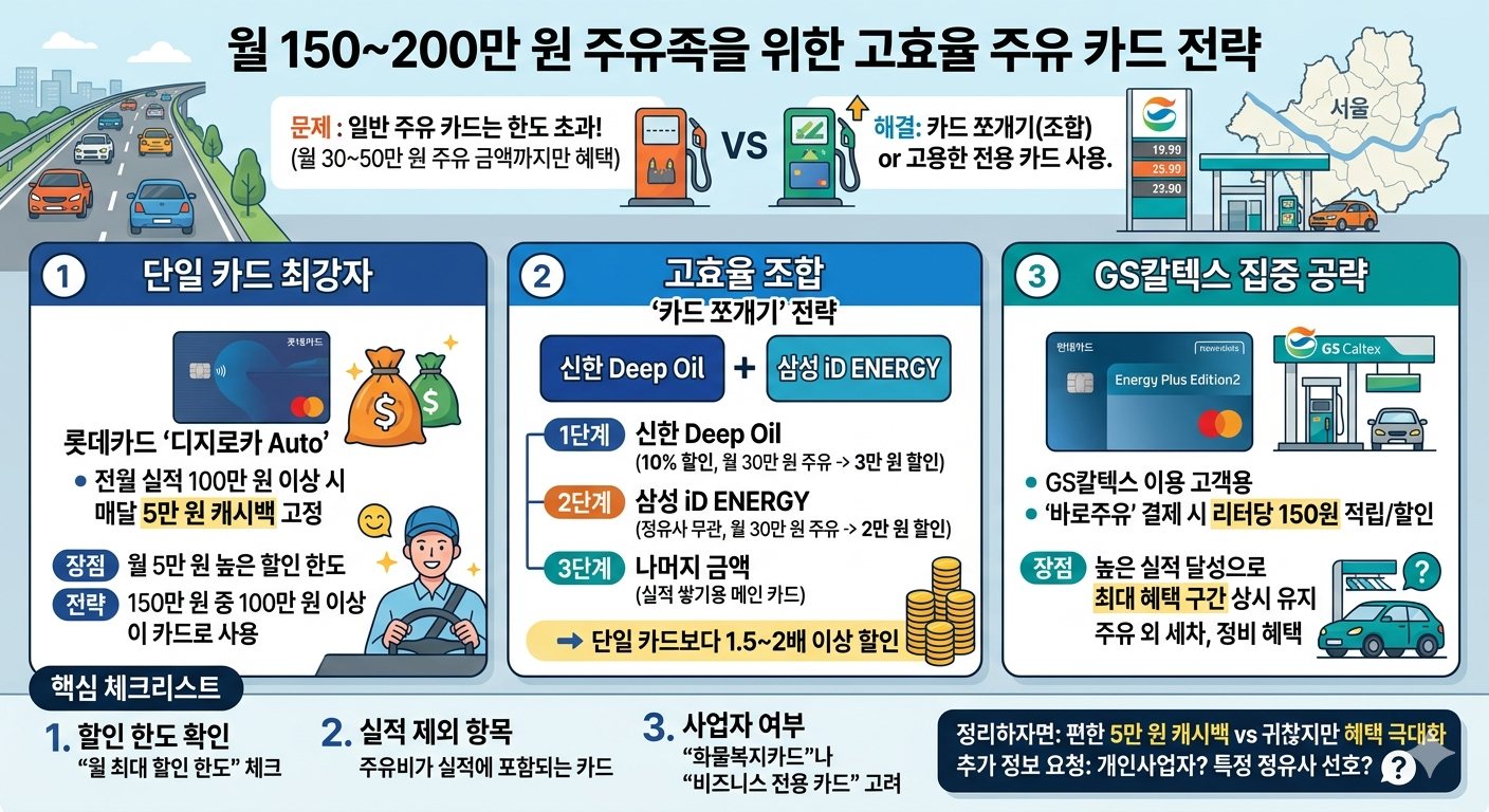 월 150~200만 원을 주유비로 지출하신다면, 일반적인 주유 카드의 '월 할인 한도'를 금방 초과하게 됩니다.