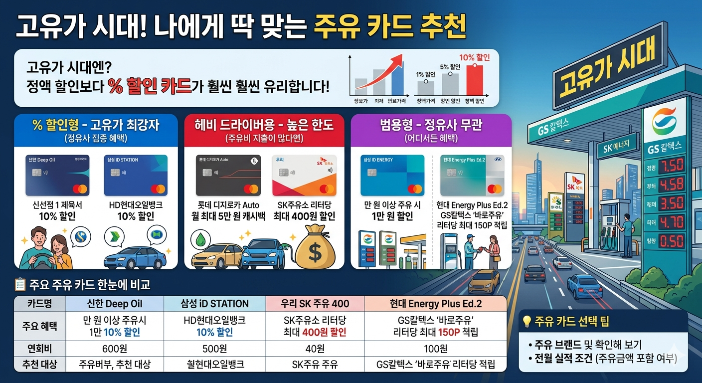 고유가 시대에는 리터당 정액 할인보다 결제 금액 대비 % 할인 카드를 선택하는 것이 훨씬 유리합니다.