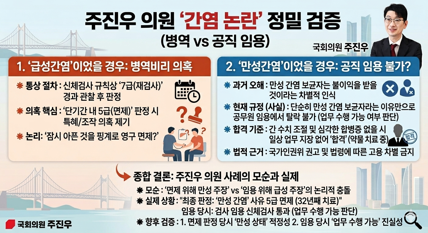 * 급성 vs 만성 여부: 야당과 일부 의료계 인사들은 "급성 간염은 보통 일시적이라 재검 대상(7급)이지 바로 면제(5급)가 되기 어렵다"며, 단기간에 면제 판정이 내려진 과정에 의구심을 제기했습니다.