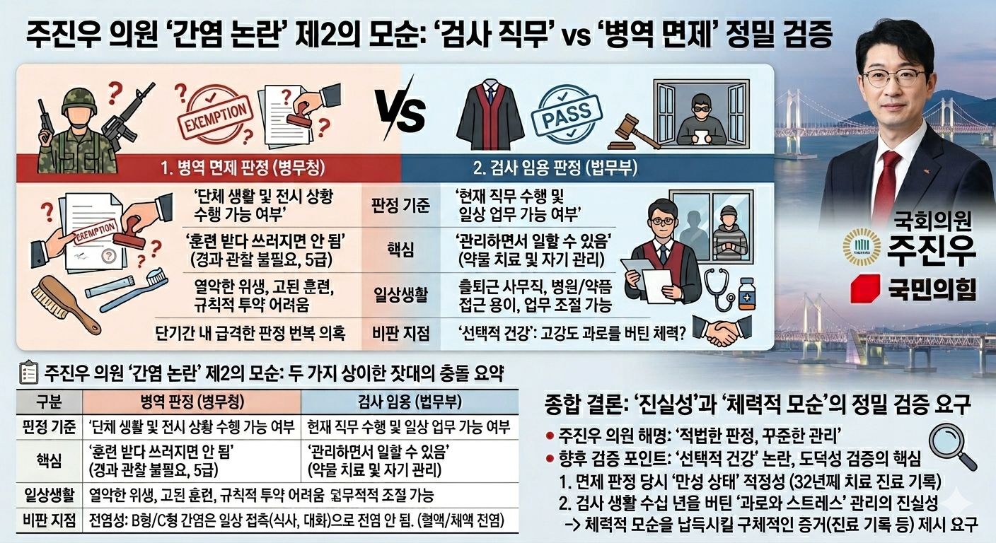 * 검증의 방향: 따라서 향후 검증은 "만성인데 어떻게 공무원이 됐나"가 아니라, "당시 면제 판정을 받을 정도의 만성 상태가 맞았는지(질병 정도의 적정성)"와 "검사 임용 시 건강 상태가 실제로 정상 업무 수행이 가능했는지(관리 상태의 진실성)"에 맞춰질 것입니다.
