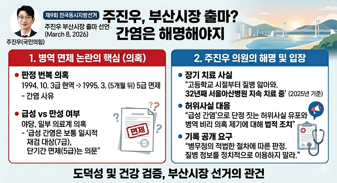 * 실제 판정: 주 의원은 최종적으로 만성 간염을 사유로 5급 면제 판정을 받은 것으로 알려져 있습니다. (32년째 치료 중이라는 해명과 일맥상통합니다.)
