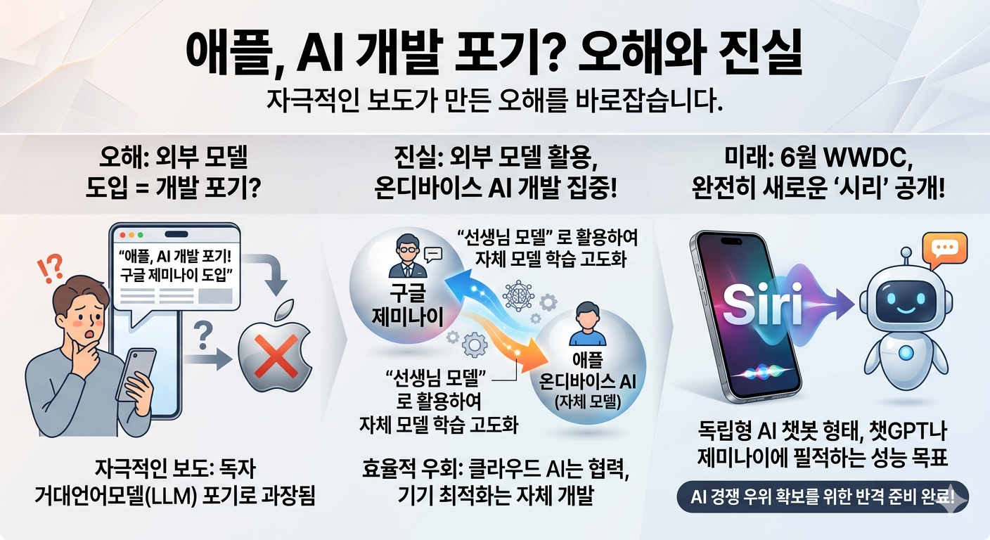 * 오해의 발단 (구글 제미나이 도입): 지난 2026년 1월, 애플이 차세대 '시리(Siri)'를 구동할 핵심 AI 모델로 구글의 '제미나이(Gemini)'를 선택하고 대규모 계약을 맺었습니다.