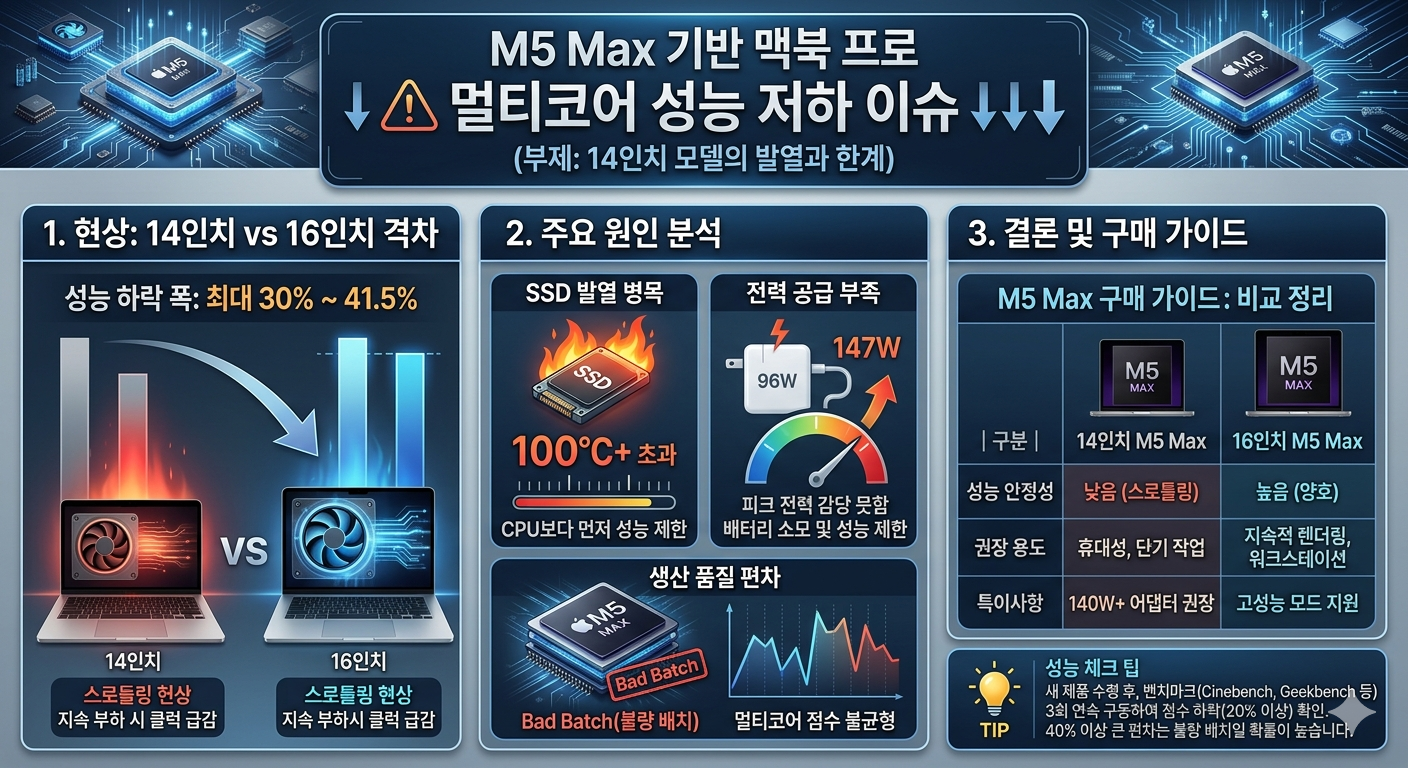 * 성능 하락 폭: 14인치 M5 Max 모델은 발열 제어 실패로 인해 16인치 모델 대비 멀티코어 성능이 최대 30%~41.5%까지 낮게 측정되는 사례가 보고되었습니다.