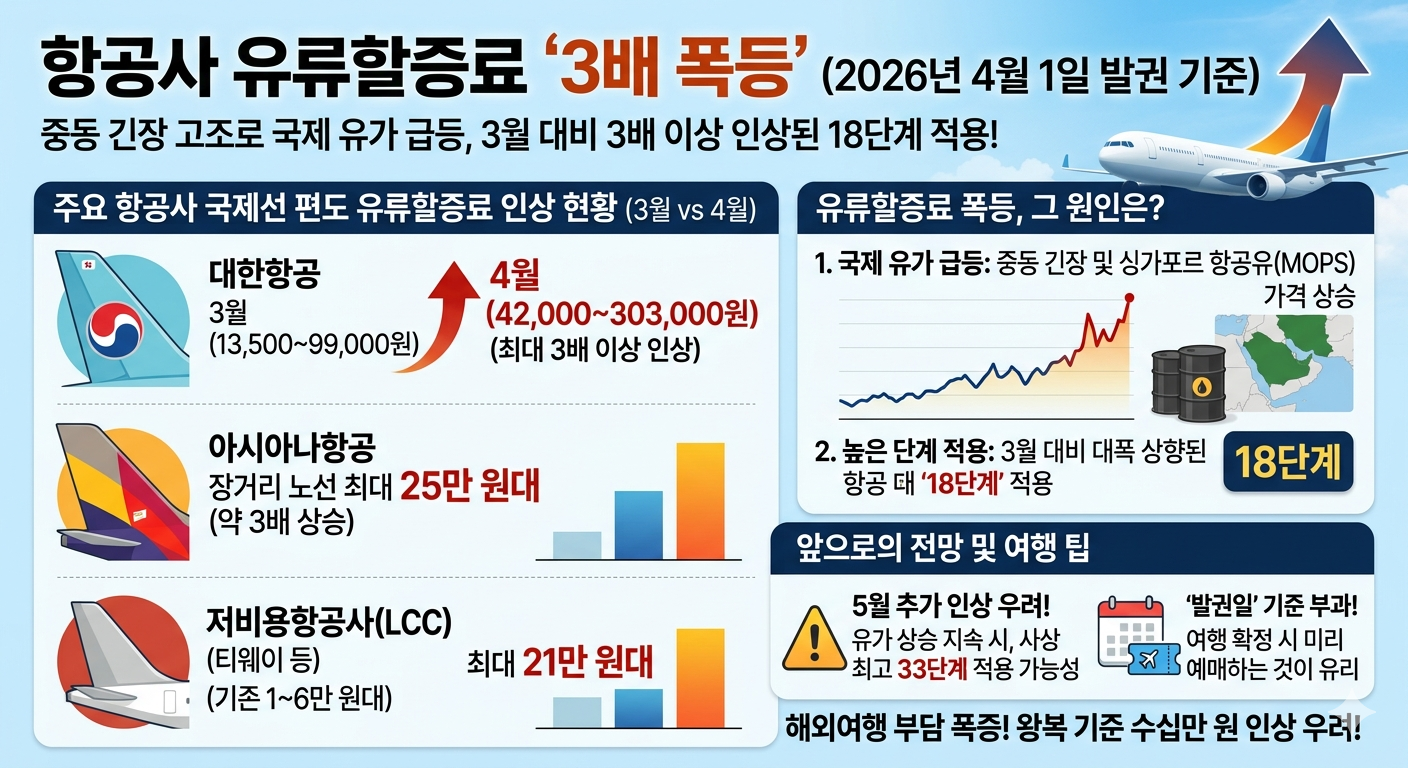중동발 유가 급등으로 인해 2026년 4월 1일부터 유류할증료가 전월 대비 최대 3배 이상 폭등한 것은 움직일 수 없는 사실입니다.