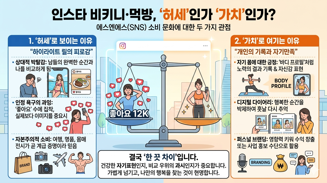 인스타그램의 '비키니 사진'이나 '고급 먹방 사진'을 보며 "저게 정말 가치 있는 행동인가, 아니면 그저 보여주기식 허세인가"라는 의문이 드는 건 아주 자연스러운 반응이에요.