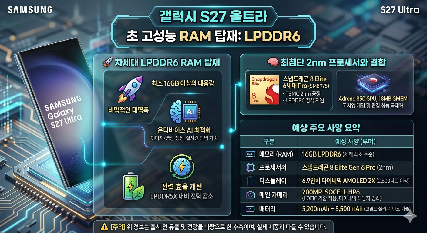 2027년 초 출시될 것으로 예상되는 갤럭시 S27 울트라는 차세대 메모리 규격인 LPDDR6 RAM을 탑재하여 압도적인 성능 향상을 이룰 것으로 보입니다.