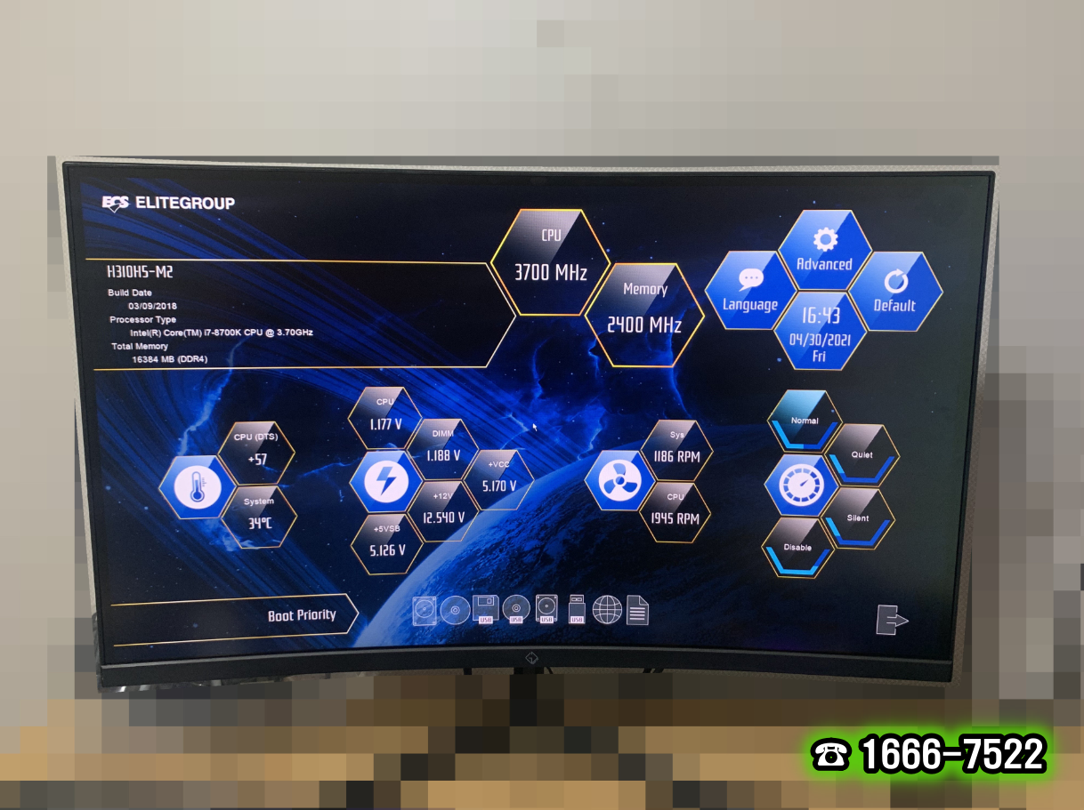 재부팅하고 단축키 F2를 눌러 ECS H310H5-M2 메인보드 바이오스에 진입했습니다. 현재 상태에서는 자세히 설정을 확인할 수 없습니다. 그래서 Advanced를 클릭해 고급 모드로 진입했습니다. 기본 설정을 확인하고 Boot에서 iODD Virtual CDRom을 첫 번째 순서로 설정하고 Exit에서 저장합니다.