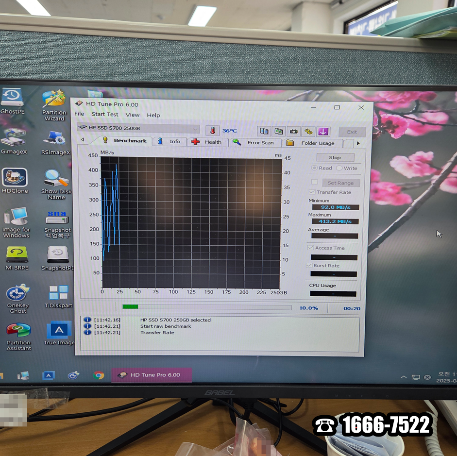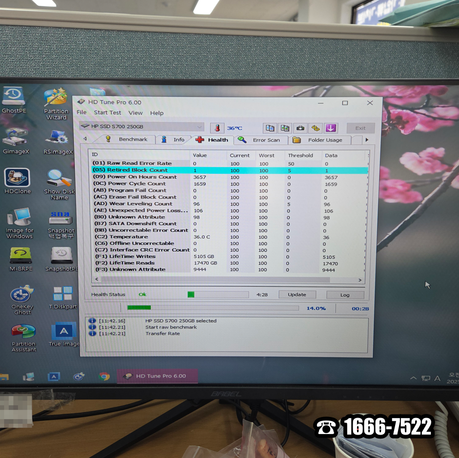 무리 없이 Windows10 PE로 부팅했습니다. 이것만으로도 안심할 수 있었습니다. 내 PC에 진입했더니 드라이브 용량은 충분하진 않았지만 부족한 것도 아니었습니다. 용산더힐 후암동 컴퓨터수리는 HD Tune Pro를 실행했습니다. HP SSD S700 250GB에 벤치마크 속도는 증폭이 너무 심했고 디스크 상태에 (05) Retired Bolck Count 오류가 발생했습니다. 고장입니다.