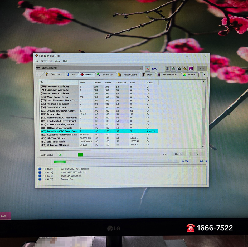 항상 점검을 한땐 Windows10 PE로 부팅합니다. 윈도우 부팅이 안될 때는 어쩔 수 없죠. 다시 내 PC에 진입해 드라이브 상태를 다시 한번 확인합니다. 그리고 대성유니드 신내동 컴퓨터수리는 HD Tune Pro를 실행했습니다. 안타깝게도 TS120GSSD220S에 벤치마크 속도는 안정적이고 빠르지만 디스크 상태에 (C7) Interface CRC Error Count 오류가 발생합니다. 고장입니다.