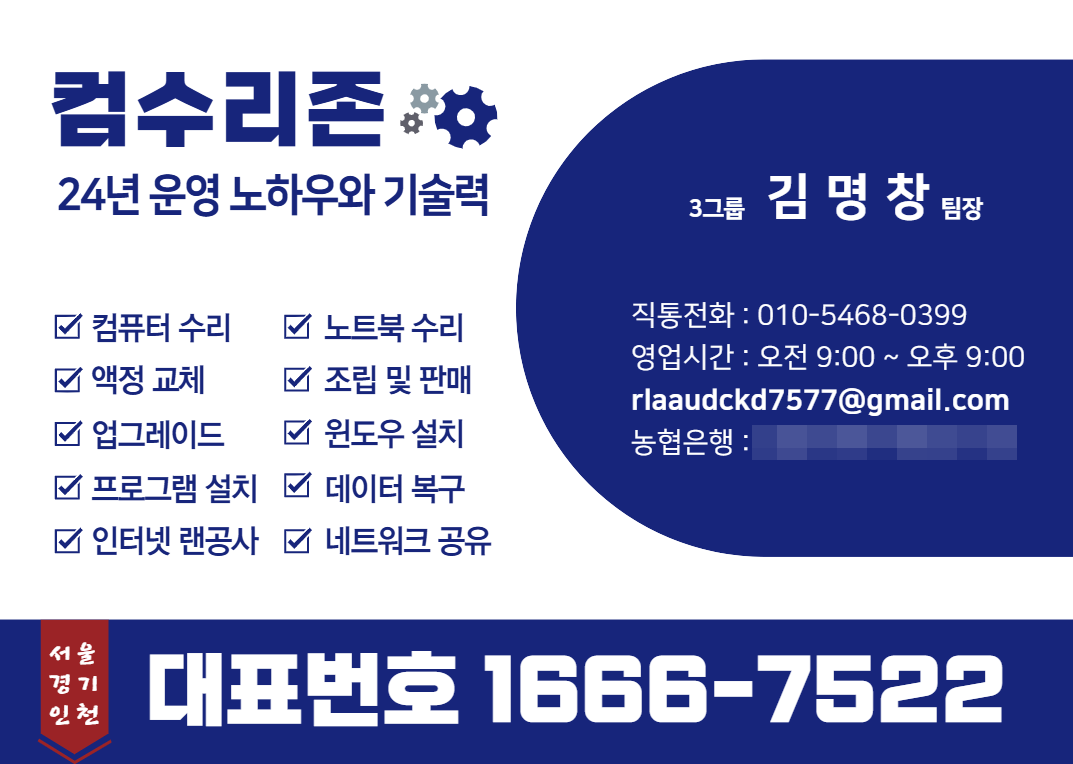 ⏰ 컴수리존 영업시간 : 오전 9:00 ~ 오후 9:00 (주말,휴일,야간,당일 출장 가능)